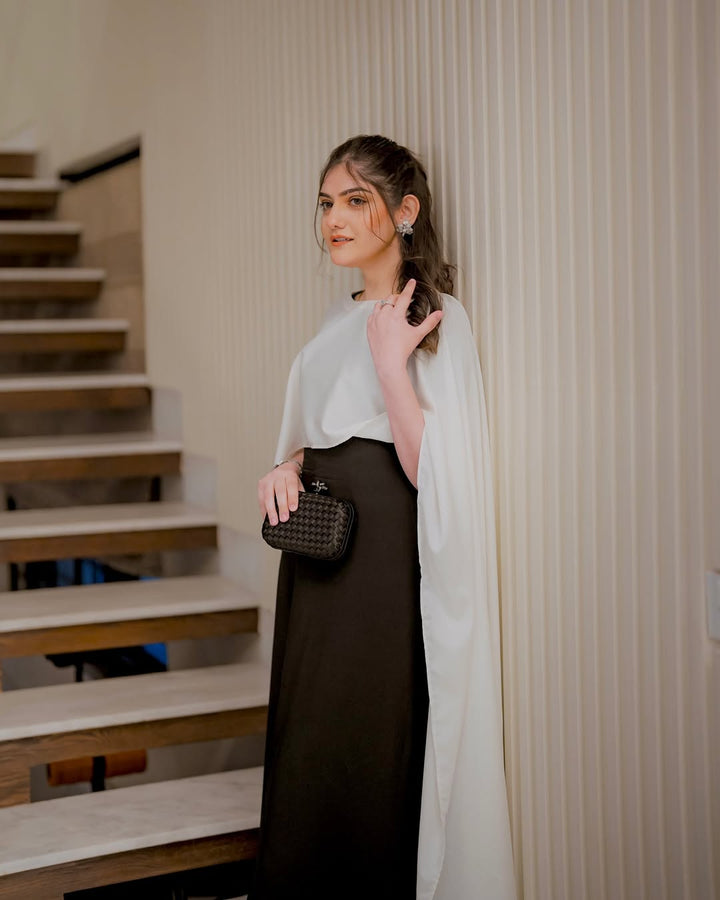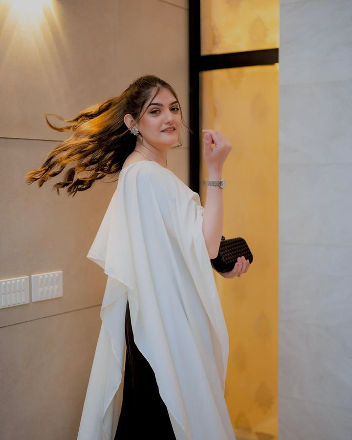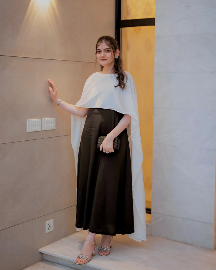 Elevate your style with the Black and White Cape Dress — a modern blend of elegance and sophistication. Featuring a sleek black base with a flowing white cape overlay, this dress makes a bold statement while maintaining a timeless charm. Perfect for formal dinners, evening events, or festive gatherings.