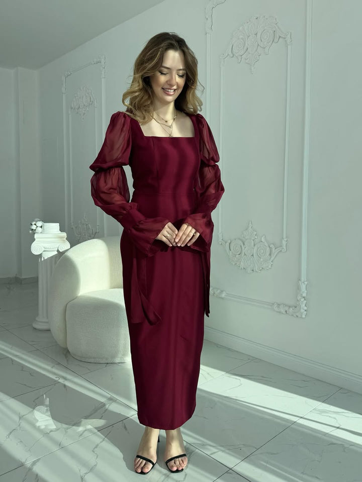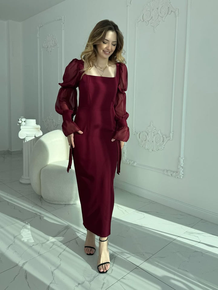 Elevate your look with the Fitted Midi Dress featuring delicate tie-cuff organza sleeves. Its sleek silhouette and refined design offer a sophisticated and flattering fit, perfect for formal events, evening gatherings, or special occasions.