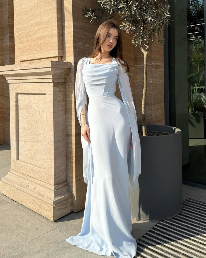 Radiate elegance in the White Chiffon Gown. Crafted from lightweight chiffon, it features wide flutter sleeves and a flowing silhouette for a graceful, feminine look. Perfect for formal events, evening gatherings, or special occasions.